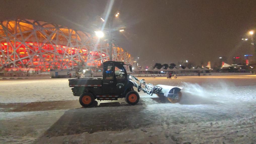 北京环卫集团城市机扫公司在奥林匹克公园中心区展开除雪作业。新华社发